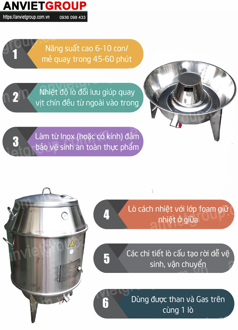 -Các loại lò nướng thông thường hoạt động theo cơ chế đốt than bên dưới gà vịt nướng bên trên mỡ nhỏ xuống tạo ra rất nhiều khói ảnh hưởng tới người xung quanh và khói bụi bám vào sản phẩm dẫn đến mất an toàn vệ sinh.Lò nướng gà vịt không khói được nướng trong môi trường khép kín không tiếp xúc với khói bụi nên an toàn và hiện đại hơn rất nhiều.Bên cạnh đó Lu máy nướng vịt quay lợn quay có lớp cách nhiệt nên rất an toàn nếu có vô tình chạm vào bất kì bộ phận nào trên máy cũng không gây bỏng.
